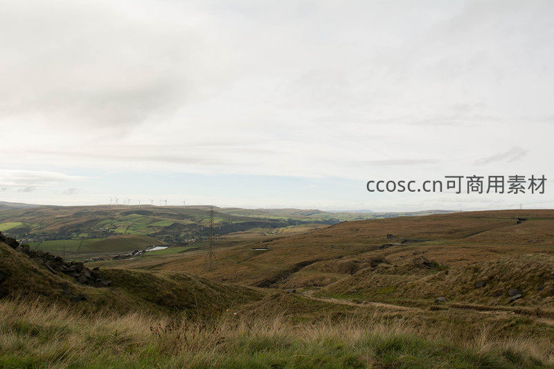 连绵起伏的丘陵覆盖着枯黄与翠绿交织的草地,远处可见成排风力发电机矗立于山脊之上,天空云层密布,静谧而辽阔。