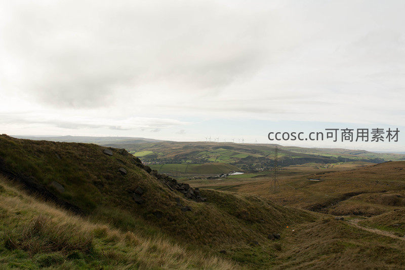 蜿蜒泥泞的小路穿过草坡,两侧散落石块与低矮石墙,远方山谷中村落隐约可见,天空灰白,氛围宁静而略带苍凉。