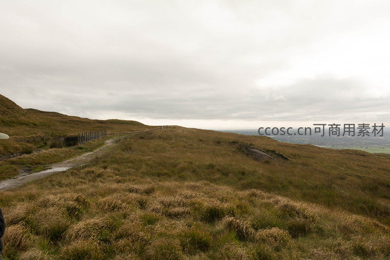 站在山顶小径旁,眼前是无垠的草原与起伏的山峦,远处城市若隐若现,天空云层密布,带来一种静谧而深远的自然沉浸体验。