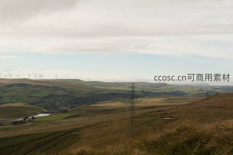 连绵起伏的山丘上,一排排白色的风力发电机矗立在远方,近处是干枯的草地和一座高耸的输电塔,展现了自然与现代能源设施的和谐共存。