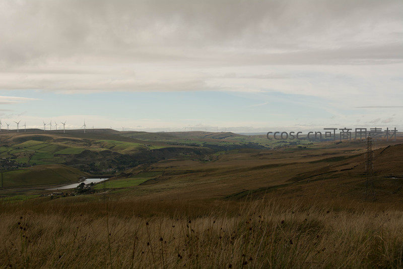连绵起伏的绿色丘陵上,一排排白色风车矗立在远方,与低垂的厚重云层构成一幅宁静而壮阔的田园画卷。