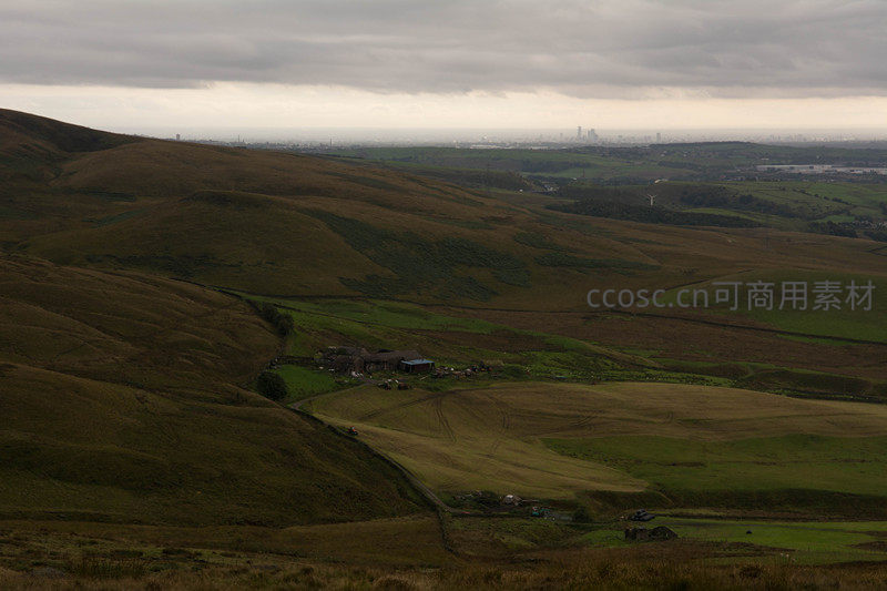 坐落在幽深山谷中的几座农舍,周围环绕着层次分明的田地,远处的城市高楼在阴云下显得渺小而遥远,充满宁静感。