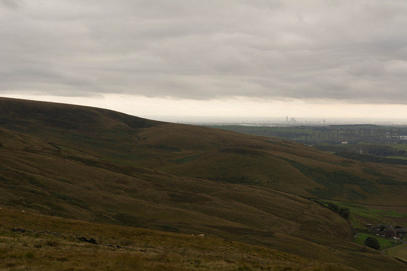 层层叠叠的褐色山丘在厚重云层下延展,山坡上偶见羊群悠闲吃草,远方城市高楼如剪影般矗立,自然与都市在此形成强烈视觉对比。