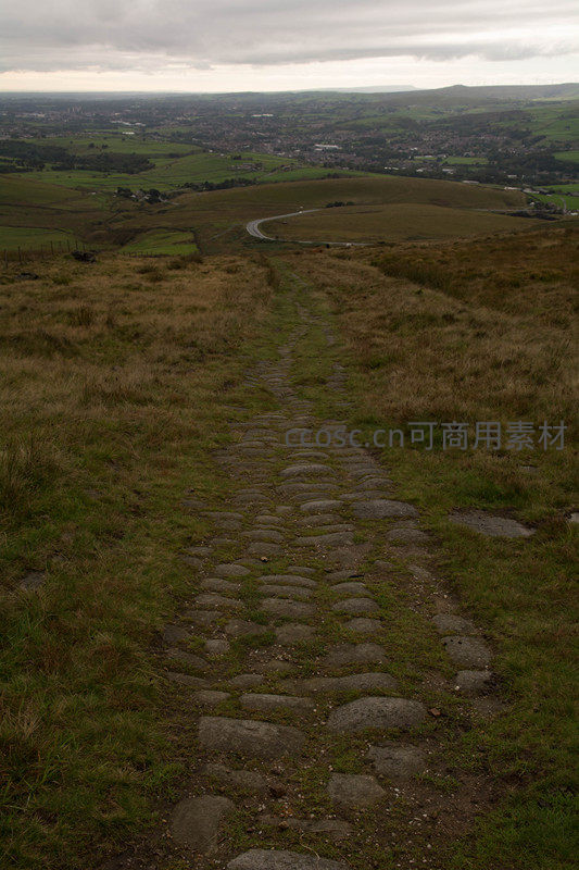 由不规则石块铺就的古老小径从脚下延伸,穿过青黄相间的草坡,直指远方山谷中的小镇,是徒步爱好者探索乡野的理想路径。