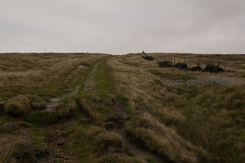 浓重的云雾低垂,将视野压缩在脚下的石径与两侧干枯的草甸之间。小路尽头隐约可见几处石墙与木栅栏,仿佛引领旅人走向一个被遗忘的角落,神秘而引人遐想。