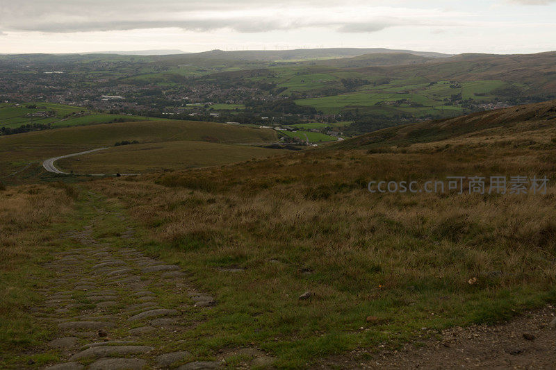 从高处俯视,一条石子小路如丝带般缠绕在起伏的山坡上,下方是整齐划分的绿色农田与密集的住宅区,远处群山连绵,云层低垂,展现出城乡交融的壮丽画卷。