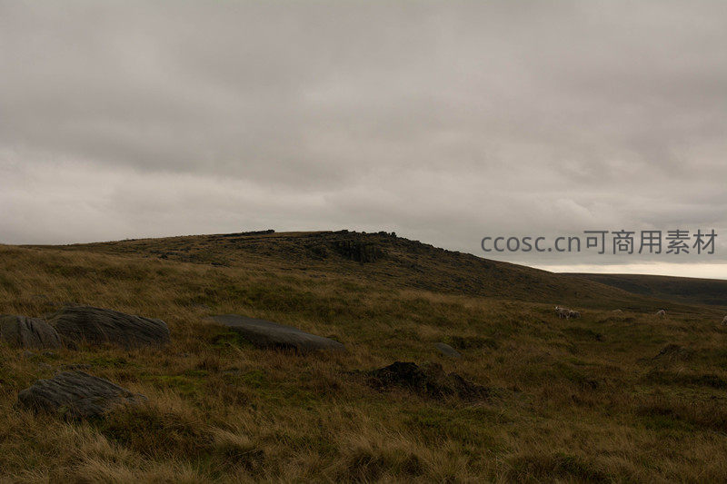 在辽阔的草原上,远处的山丘轮廓分明,几只白色的羊群悠闲地散布在山坡上,与近处的巨石和枯草形成对比,整个画面充满了宁静与生机。