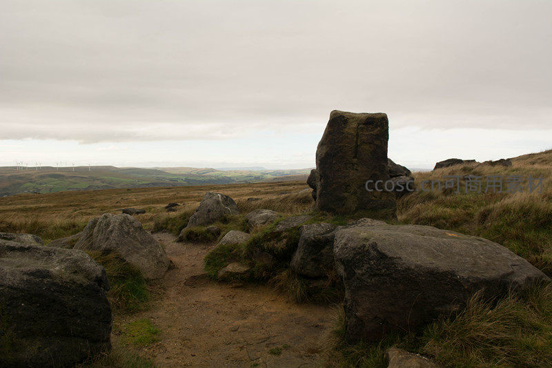 一条泥土小径蜿蜒穿过布满巨石的高地,背景是起伏的绿色山峦和成排的风力发电机,天空灰蒙,尽显自然原始之美。