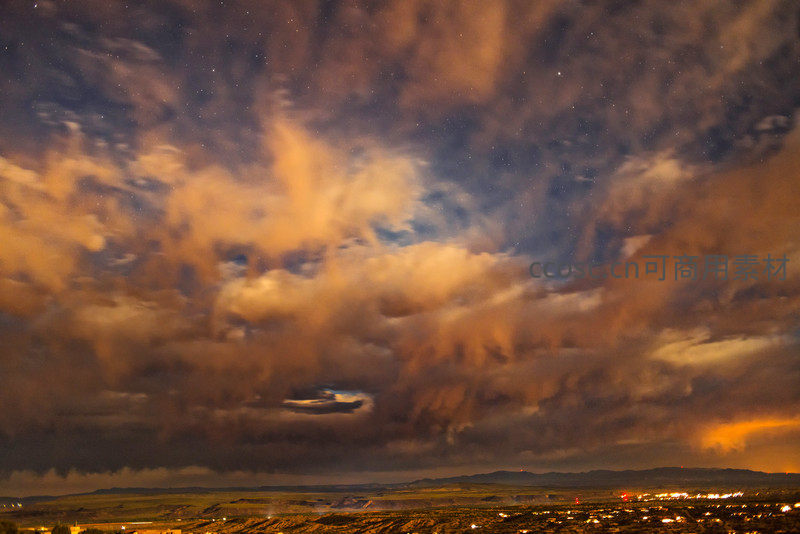 夜空中云层翻涌,点点繁星若隐若现,下方城市灯火连绵,勾勒出地平线轮廓,呈现天地交融的壮阔夜景。