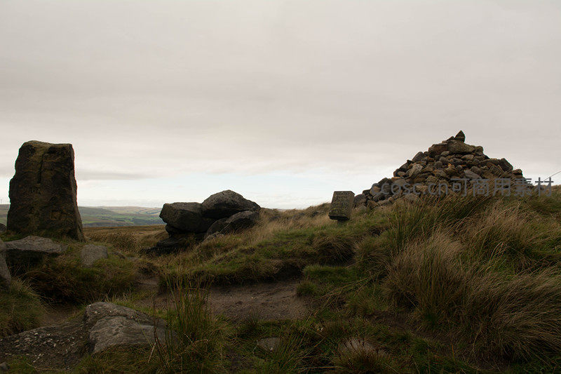 山脊之上,一座人工堆砌的石堆与一块孤立的石碑遥相呼应,脚下是随风摇曳的枯草,远处山峦与风车构成一幅辽阔的自然画卷。