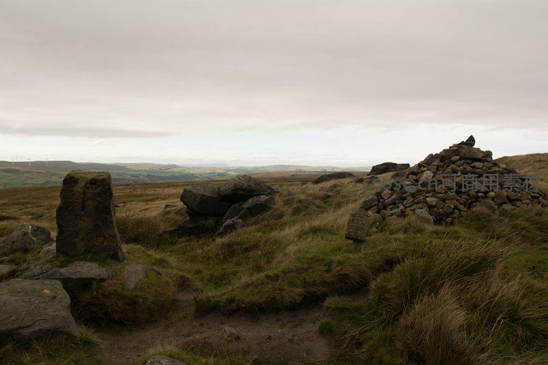 山坡上一座由碎石堆砌的古老遗迹静静伫立,周围是广袤的草地与散落的巨石,远处云雾缭绕,仿佛诉说着过往的岁月痕迹。