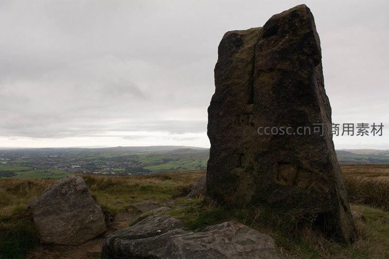 一座饱经风霜的巨大岩石静立于荒凉山巅,在灰蒙蒙的天幕下显得格外雄伟,其表面斑驳的痕迹仿佛诉说着这片土地上被遗忘的古老故事。