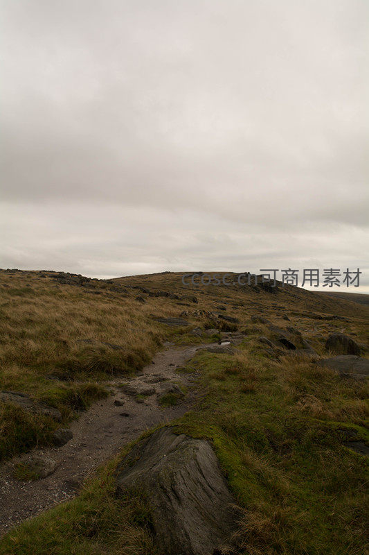 一条泥泞崎岖的小路沿着长满青苔的山脊蜿蜒前行,两侧是干枯的野草和嶙峋的岩石,天空阴沉,为这段野外徒步之旅增添了几分挑战与诗意。
