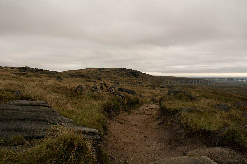 一条蜿蜒的土路穿过布满岩石和枯黄草地的荒原,远处山丘在阴云下静默矗立,展现原始而宁静的自然之美。