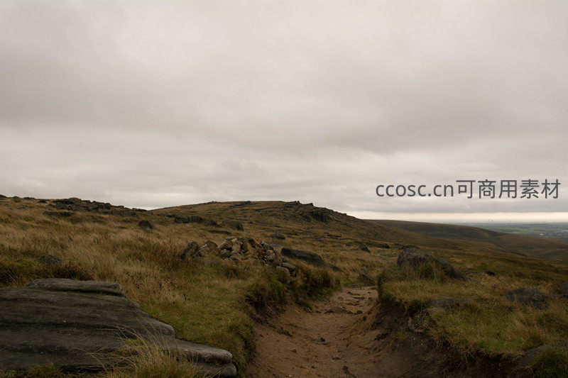 灰暗天空笼罩着起伏的山野,泥土小径在巨石与枯草间延伸,为户外爱好者提供了一条充满挑战与野趣的探索之路。