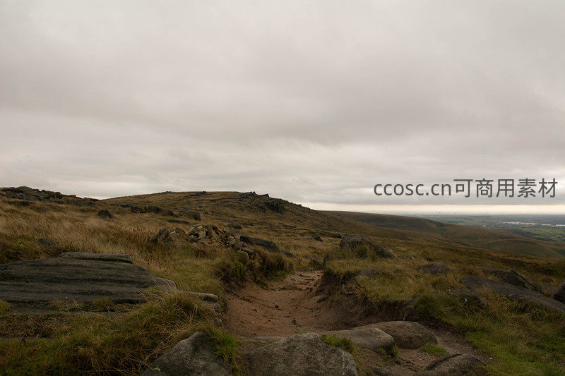 一条被踩踏出的土路在荒凉的山坡上曲折前行,两旁散布着大小不一的岩石和干枯的野草,远处地平线隐约可见。