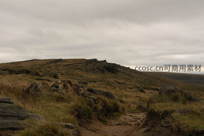 低矮山脊下一条泥泞小路穿行于散落的巨石之间,周围是枯黄的草甸,在阴沉天空下更显苍凉与孤寂的野性魅力。