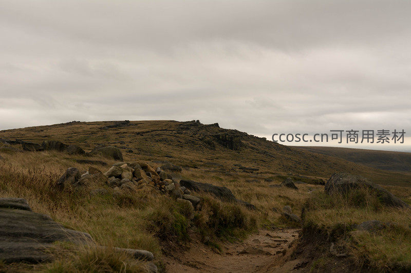 阴天荒原中通往山顶的原始土路