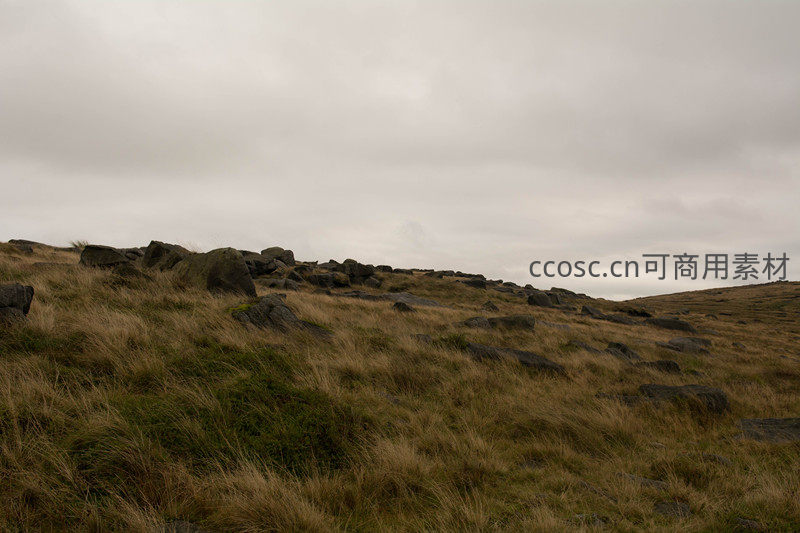 厚重的云层压得很低,笼罩着布满岩石和枯草的山脊,整个画面充满静谧感,仿佛时间在此凝固,适合徒步探索。