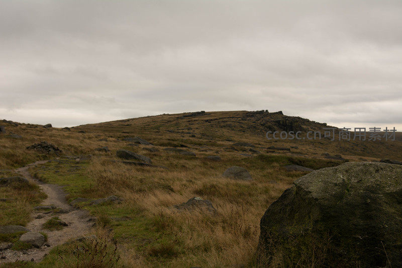 一条崎岖的土路从前景延伸至远处的山丘顶端,周围遍布岩石与枯黄植被,远处地平线隐约可见,充满探索与冒险的气息。