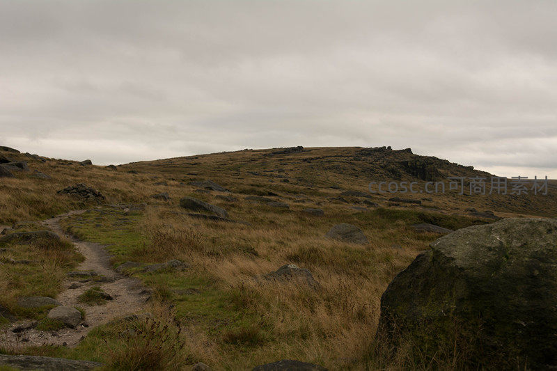 画面右侧一块巨大的岩石静静矗立,左侧是通往山丘的小径,四周是枯黄与翠绿交织的草地,展现粗犷而宁静的野外风光。