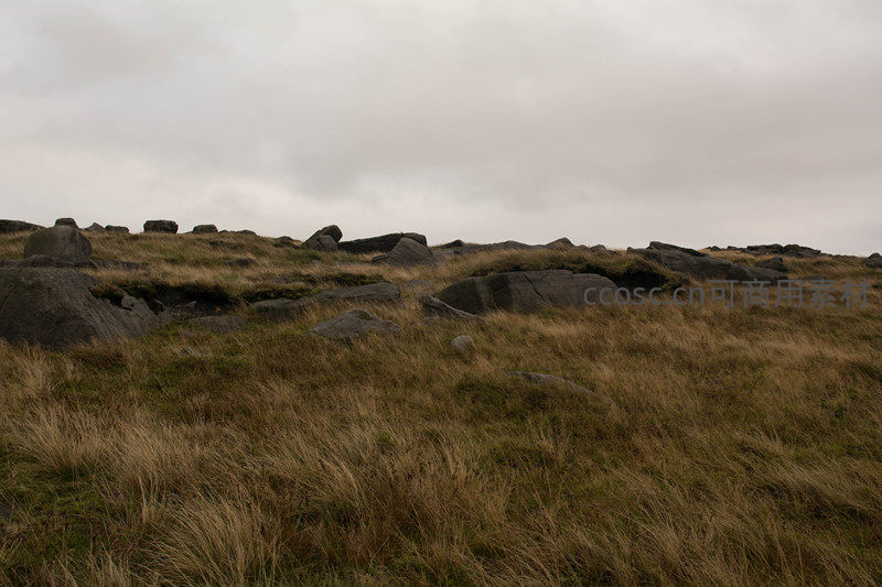 在持续风力侵蚀下形成的草坡上,无数岩石如沉默的守卫般散落其间。头顶是厚重的阴云,整个场景散发着一种原始、未被扰动的静谧力量,引人遐思。
