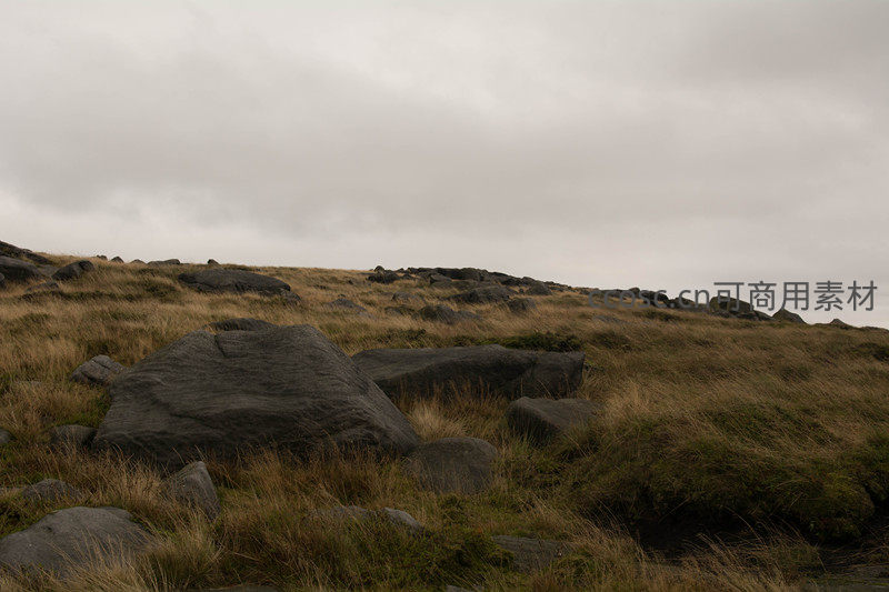 广袤无垠的草原被无数深色岩石点缀,灰白天空低垂,整个画面弥漫着苍凉而壮阔的原始自然气息。