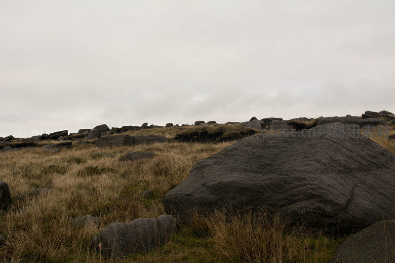 一块巨大的深灰色岩石静卧在覆盖着枯黄野草的山坡上,背景是朦胧的天空,整个画面弥漫着一种孤寂而壮阔的气息。