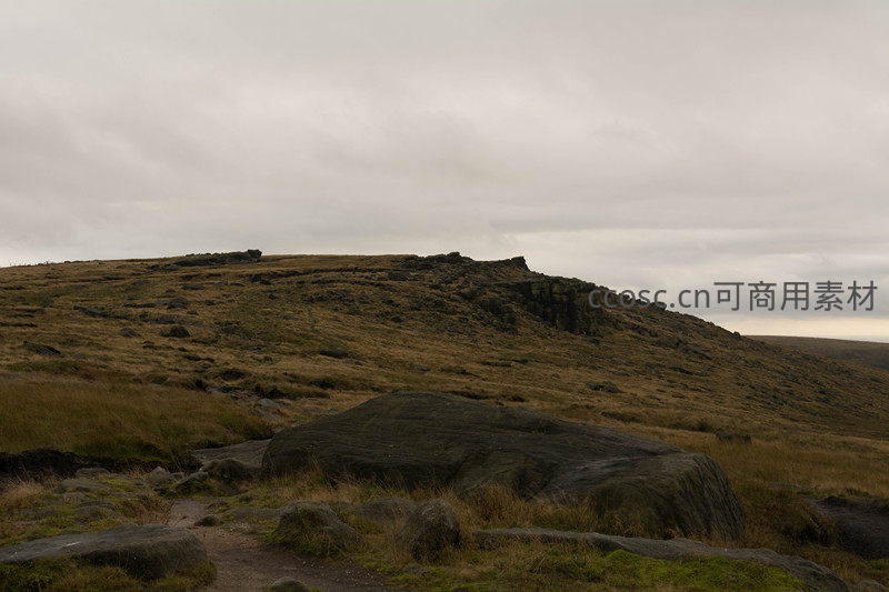 在阴云密布的天空下,一条蜿蜒的小径穿过覆盖着枯黄草甸的山丘,散落的巨石点缀其间,营造出一种苍凉而宁静的氛围。