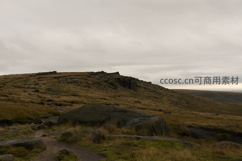 广袤的高原草甸在阴沉天气中呈现出深浅不一的棕绿色,巨大的黑色岩石如沉睡的巨兽般散布其中,小径隐没于草丛与石块之间。