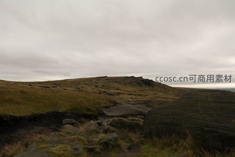 灰白云层压得很低,覆盖着布满岩石和枯草的山地,小径在乱石间延伸,充满原始野性。