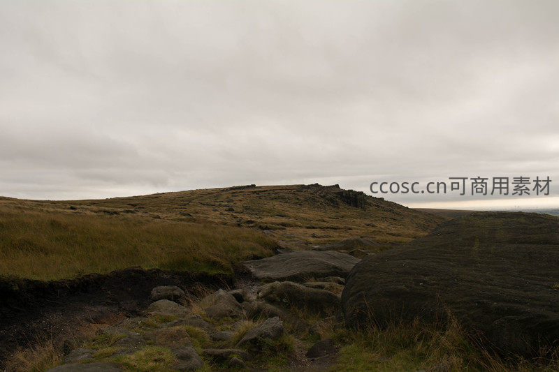 在广袤的枯黄草原上,一条由天然石块铺成的小路通向远方山丘,天空阴郁,静谧悠远。