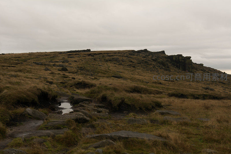 泥泞石径边有小水洼倒映灰暗天空,周围是干枯草地与嶙峋岩石,营造出孤寂清冷之感。