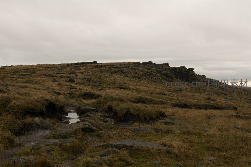 通往山丘边缘的土石小径两旁杂草丛生,远处岩壁陡峭,天色阴沉,适合独自远足探索。
