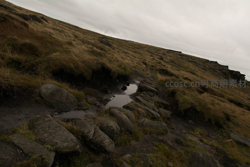 雨后斜坡上,湿漉漉的石径蜿蜒而上,枯黄的野草随风轻摆,水坑倒映着苍茫天空,营造出一种静谧又略带萧瑟的氛围。
