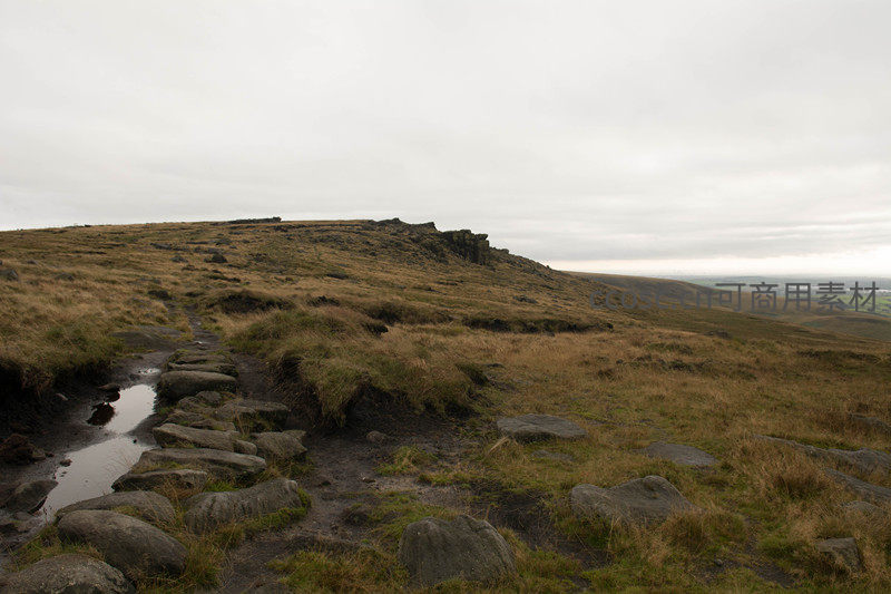 一条由大块岩石铺成的崎岖小径蜿蜒穿过枯黄的草地,延伸至远处的山丘。天空阴沉,为这片荒凉而宁静的自然景观增添了几分苍茫感。