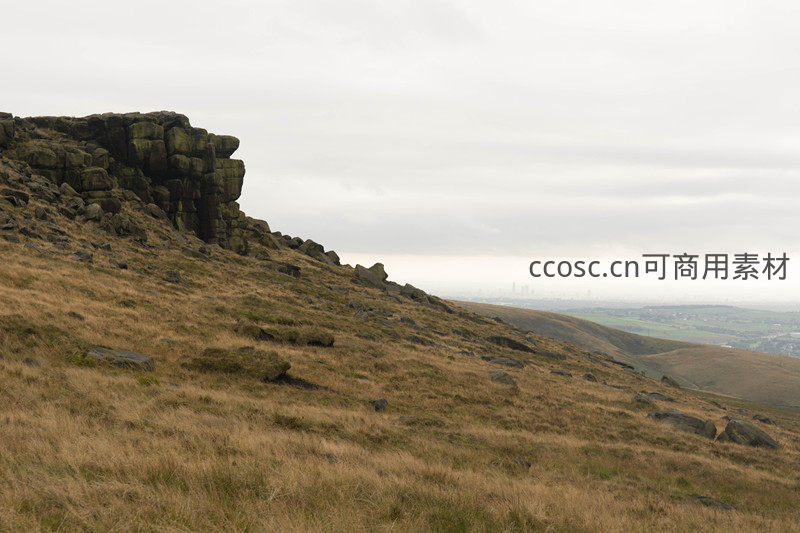 陡峭的岩石悬崖矗立在山坡之上,其下是连绵起伏的枯草坡地。从高处远眺,远方的城市轮廓在薄雾中若隐若现,形成自然与人文的强烈对比。