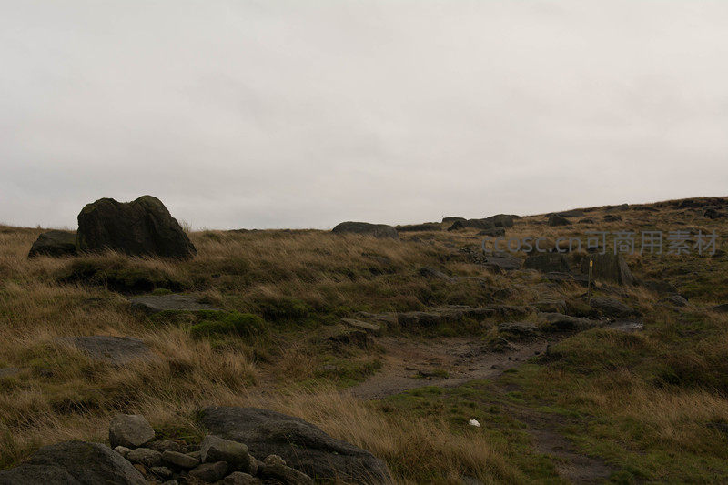 一条泥泞小路在起伏的草地上曲折延伸,两旁散落着大小不一的岩石,远处地平线模糊不清,营造出一种空旷、宁静且略带神秘的野外氛围。