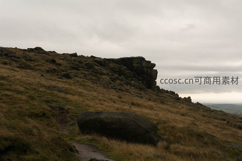 从山腰视角望向高耸的岩壁,其下方是缓缓倾斜的草地和零星巨石。远处地平线延伸至无垠平原,天空灰白,整体画面充满地理纵深感。