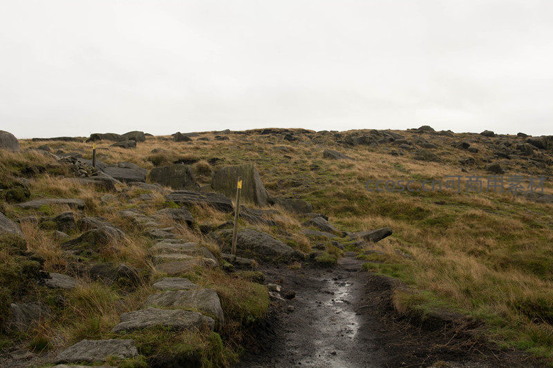 一条蜿蜒的泥土小路在布满大小不一岩石的山坡上延伸,稀疏的枯草随风摇曳,尽显野外探险的意境。