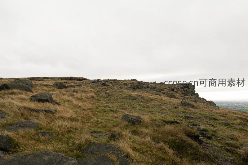 站在岩石嶙峋的高地边缘,眼前是起伏的丘陵和远方隐约的城市轮廓,枯草覆盖的坡地在阴天中显得苍凉而辽阔,尽显大自然的雄浑气势。