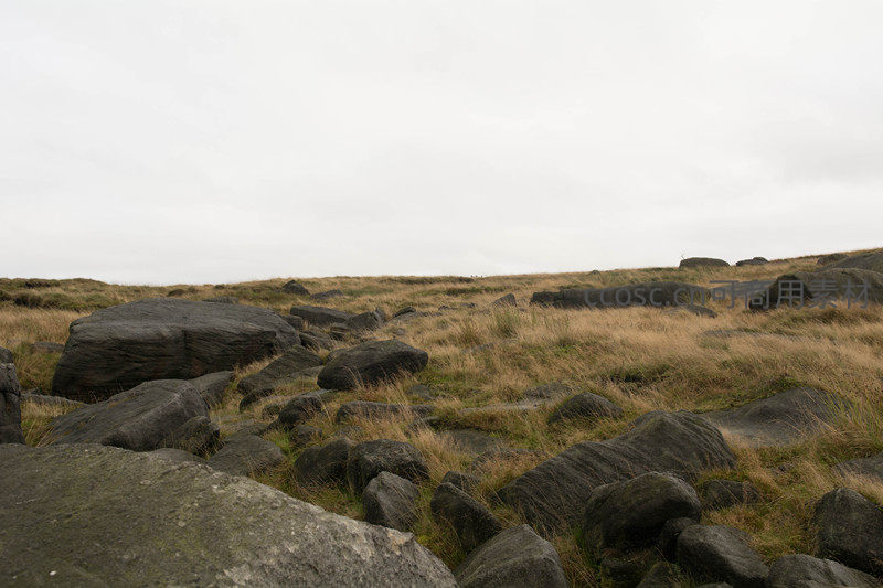一片无垠的荒原上,无数形态各异的黑色巨石如沉睡的巨兽般散落其间,枯黄的草丛在风中摇曳,阴沉的天空更添一份苍茫与孤寂之感。