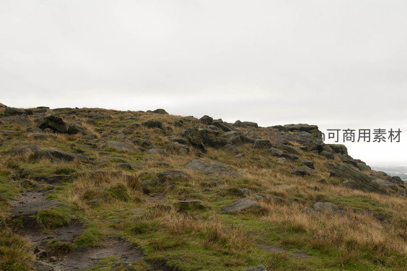 山脊线蜿蜒曲折,深色岩石如巨兽般蛰伏在枯草之间,远处天际线朦胧,营造出一种辽阔而孤寂的自然氛围。