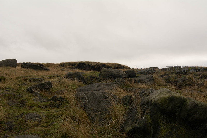 在阴沉天空下,一片广袤的荒野上散布着巨大的岩石,枯黄的草地随风摇曳,展现出一种原始而宁静的自然之美。