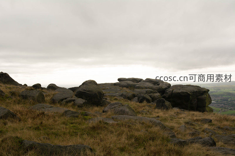 厚重云层低垂,山巅巨石如天然堡垒般矗立,下方山谷中散落着村庄与田野,构成一幅宁静而辽阔的田园画卷。