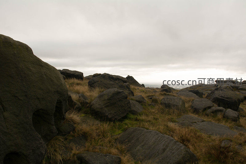 在灰蒙蒙的天空下,广袤的荒原上散布着巨大的黑色岩石,其间点缀着干枯的黄草,营造出一种苍凉而宁静的自然氛围。