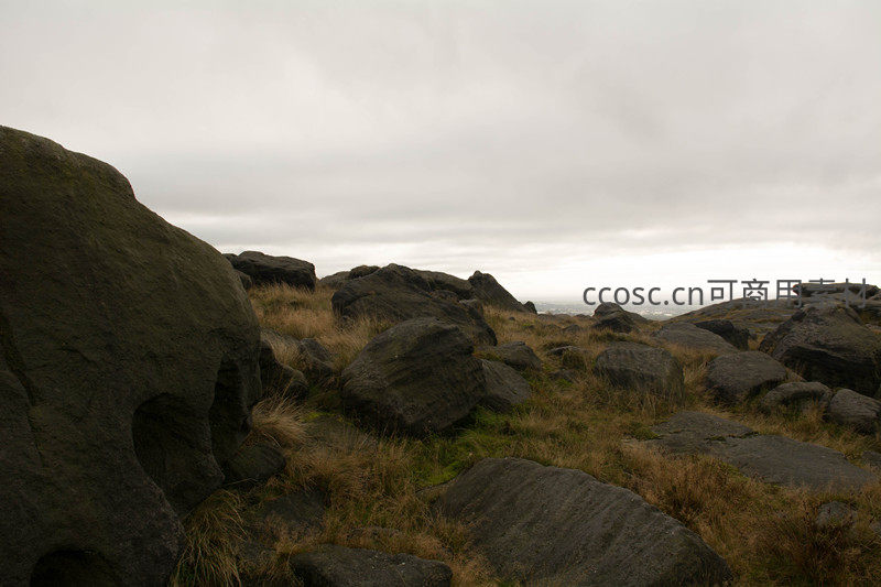 从高处俯瞰,前景是布满巨大岩石和枯黄草地的山脊,远处地平线上隐约可见城市的轮廓,阴云密布的天空更添几分壮阔与孤寂。