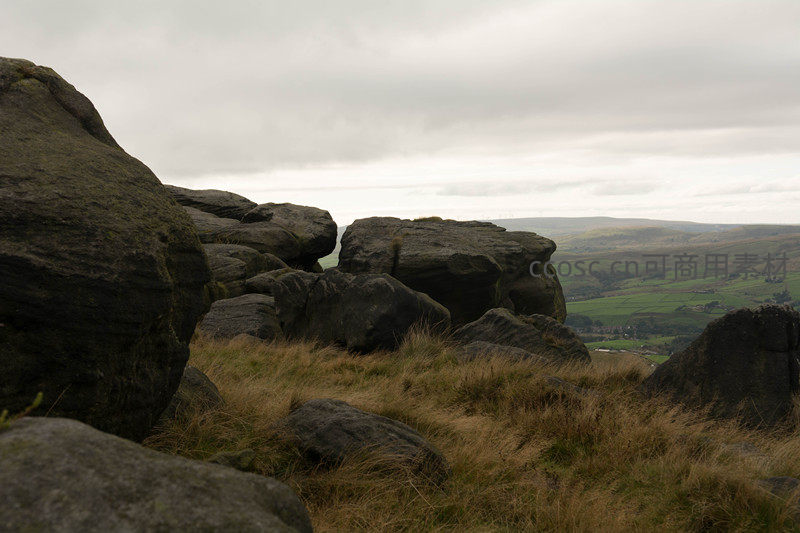 前景是巨大而嶙峋的黑色岩石群,覆盖着枯黄草丛,向远方眺望,绿色山谷与村庄隐约可见,灰白天空下尽显大地的粗犷与苍凉之美。