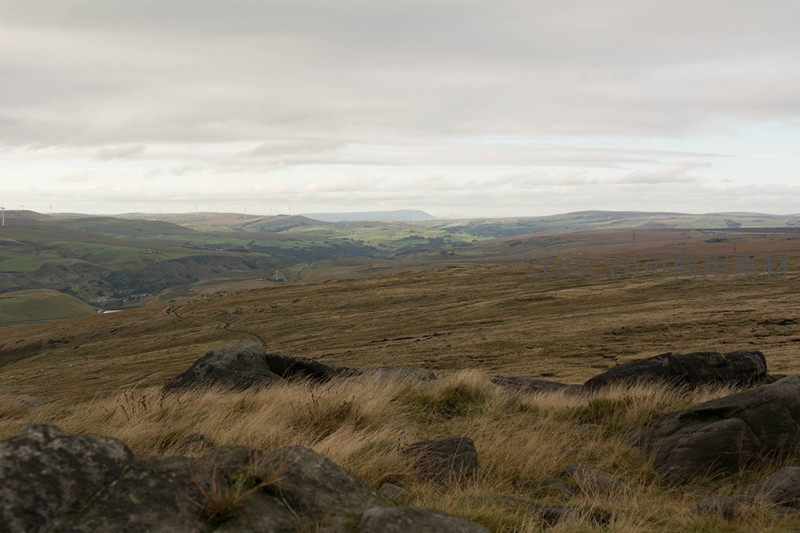 广袤的高原草地上散布着大小不一的岩石,远处山脊线上排列着多座白色风车,下方是绿意盎然的农田与聚落,阴天光线柔和,展现出人与自然共存的和谐景象。