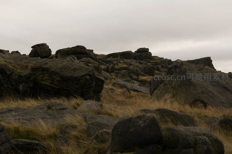 在灰蒙天空下,巨大的黑色岩石散落在枯黄草甸中,构成一幅原始而宁静的自然画卷,展现了大地粗犷的质感与季节的萧瑟之美。